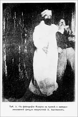One of the most active critics of Hartmann's book was Alexander Aksakov.[60][note 21] The proofs which Aksakov used to "disprove Hartmann's hallucination hypothesis" were the photographs of spirits. The pictures "taken during the séances, in which both the medium and the materialised form were visible," were convincingly demonstrating, according to Aksakov, that materialisation is "an objective phenomenon", and not a kind the mass hypnosis (see the photo on the left). Criticism by Aksakov was supported in the publications of occultists in the journal Sphinx, where "Hartmann was portrayed variously as obtuse or dishonest for his refusal to recognise his logical errors."[24] Aksakov has been emphasizing that Hartmann had no practical experience and did not pay enough attention to those facts that did not correspond to his convictions, and many phenomena were "completely unknown" to him.[62][note 22]
