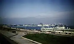 During the Soviet Union, there have been major changes in the territory of the Spit. February 5, 1918, the administration of wharves was established. In 1932 a large cargo port was built on this territory. Also, in the late 1930s, the destruction of Alexander Nevsky Cathedral began. On the site of the cathedral it was planned to build a giant lighthouse with a monument to Vladimir Lenin from above.[5] However, only its roof and domes were dismantled. During the entire Soviet period it was used as a warehouse and communal housing for the port workers. During the World War II on the roof of the cathedral, instead of the central dome, an anti-aircraft machine gun was installed to repel Luftwaffe attacks on the port.[6] The Spit's defense did not allow the Germans to bombing the port territory and the Oksky (Kanavinsky) bridge. After the war, the port began to increase cargo turnover and became one of the largest in the Soviet Union. During the Cold War, a network of underground anti-nuclear bunkers was built at the Spit.[7] In 1983, the restoration of Alexander Nevsky Cathedral began.