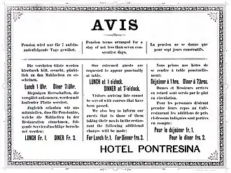 - ^ a b Avis an die Gäste, verwahrt in der Dokumentensammlung Sporthotel Pontresina im Schweizerischen Wirtschaftsarchiv (SWA) in Basel, Signatur H + I E 65.