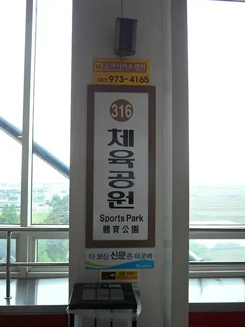 Sports Park Station (Korean체육공원역; Hanja體育公園驛) is a station of Busan Metro Line 3 in Daejeo-dong, Gangseo District, Busan, South Korea.