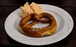 Spundekäs [ˈʃpʊndəˌkɛːs] is a spiced cream cheese spread originating from the German region of Northern Rhenish Hesse. Often served as an appetizer (especially at Straußenwirtschaften) or at gatherings, usually along with lye rolls or soft pretzels as well as regional wine, it remains a symbol of regional cultural expression.[1]