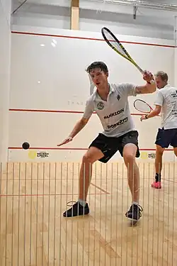 Squash, sometimes called squash rackets, is a racket sport played by two (singles) or four players (doubles) in a four-walled court with a small, hollow, rubber ball. The players alternate striking the ball with their rackets, directing it onto the playable surfaces of the four walls of the court. The object of the game is to hit the ball in such a way that the opponent is not able to play a valid return. There are about 20 million people who play squash regularly worldwide in over 185 countries.[1] The governing body of squash, World Squash, is recognized by the International Olympic Committee, and the sport will be included in the Olympic Games, starting from the 2028 Summer Olympics in Los Angeles.[2] The Professional Squash Association (PSA) organizes the pro tour.