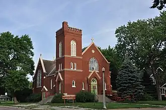 The first Catholic church in Vermillion was built in 1885, but was destroyed by a tornado in 1889, replaced with a new structure the following year. By 1900, the community had outgrown that building, and fundraising began for a larger church. Anton Dohmen, a Bavarian immigrant who was architect for many churches in Wisconsin and the Dakotas, designed the new church in the Gothic Revival style. The cornerstone was laid in August 1906, and the new church opened on September 21, 1907.[2] The parish outgrew the church and moved to a new space in 1974, selling the historic church to the Church of the Nazarene, which in turn sold it to the Vermillion Area Arts Council in 1990.[2]