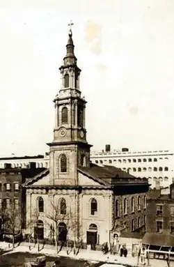 The parish was established in 1852 by Bishop Hughes, who appointed Rev. John Murray Forbes as its first pastor.[2] The parish began on Bond Street on the Lower East Side, but soon moved to a church building at East 8th Street at the north end of Lafayette Place, now Lafayette Street. That building had been constructed in 1811–12 on Murray Street by the Third Associate Reformed Presbyterian Church, and was designed by John McComb Jr. in the Georgian style; it was later moved by the Associate Reformed Presbyterian congregation to the 8th Street location. When that congregation moved uptown, the building was sold to the new Roman Catholic parish.[3]