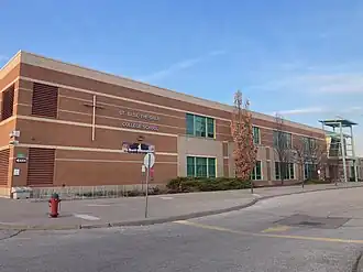The MSSB received funding from the province to rebuild St. Basil in 1993. In 1995, the MSSB acquired the former Southam Murray printing plant property on Starview Lane as the new home for St. Basil. The school was built in 1997 and completed in the fall of 1999.[2][3] Today, the school serves over 1400 students in northwestern North York and northern Etobicoke. The former campus on Weston Road was reopened by the City of Toronto as a community centre named Carmine Stefano Community Centre after the departure of its students and staff.