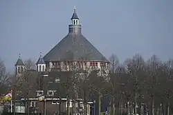 Stuyt then designed a domed church, which had an octagonal structure which supported a sixteen sided dome of reinforced concrete. One of the first such constructions in the Netherlands. It has a dwarf gallery on the outside. Two stair towers flank the western façade, in the center of which is a statue of St. Catharine.[4] The first stone was laid in 1916, and in 1918 the church was finished. The outside was renovated in 1995-1997.