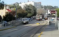 The city-owned Twin Peaks Tunnel was opened on February 3, 1918, with the K Ingleside line running through the tunnel and terminating at St. Francis Circle to avoid crossing the existing private tracks. In November 1918, the San Francisco Municipal Railway reached an agreement with the URR to allow the city's streetcars to use Market Street Railway trackage. The K Ingleside line was thus extended southwards from St. Francis Circle on Junipero Serra Boulevard and east on Ocean Avenue on February 21, 1919.[3] M Ocean View service began on October 6, 1925; the new line split from the existing tracks in the circle and ran southwest on a private right-of-way.[3] The city purchased the private company (renamed Market Street Railway in 1921) in 1944; route 12 streetcar service ended on April 8, 1945, leaving just the K Ingleside on Junipero Serra Boulevard.[2]