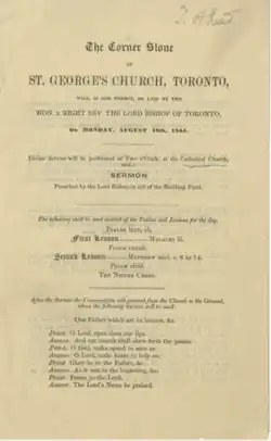 - ^ "The Corner stone of St. George's Church, Toronto, will, if God permit, be laid by the Hon. & Right Rev. the Lord Bishop of Toronto, on Monday, August 19, 1844". Toronto Public Library Digital Archive.