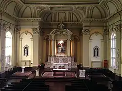 Major renovations were carried out in 1870, the transparent glass windows replaced with new stained glass. New pews to seat about six hundred people were added. A ceiling painting of the Assumption of Mary by Wilhelm Lamprecht was added. The following year, the newly renovated church was decorated for the public celebration of the twenty-fifth anniversary of Pius IX's election to the papacy; gaslight illuminations were installed for the occasion but could not be used because of adverse weather.[4]