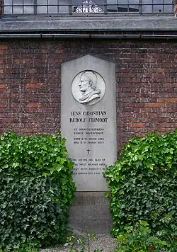 Jens Christian Rudolf Frimodt, the first pastor at the church, is buried outside the church. The headstone features a bronze relief portrait of him by August Saabye. His wife is also buried at the site. Axel Frederik Laurits Rindom (1838–1919), a later pastor at the church, is also commemorated by a stone outside the church.