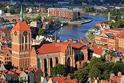 The construction of the contemporary brick edifice commenced sometime around 1370, beginning with the eastern section.[3] Simultaneously, the territory belonging to the future church was expanded for construction purposes and increased sevenfold.[4] Since its inception, St. John's was of an architectural style that was commonly found in cities and towns of the Hanseatic League, around the Baltic Sea coast.[5] The main body (naves) of the church was completed by the start of the 15th century, except for the tower.[6] Since 1453, the Teutonic Knights restricted the height of all church and secular towers in proximity to their castle at the River Motława (Mottlau), in case of a ranged attack.[7]