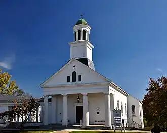 St. John's Episcopal Church is a historic Episcopal church in Wytheville, Virginia, United States. The church was built between 1854 and 1857, and is a Classical Revival style brick church building on a limestone foundation. The front facade features a pedimented portico with a full entablature supported by four monumental Doric order columns of parged brick. Atop the slate roof is an octagonal cupola with arcaded belfry. Attached to the church is a two-story, brick parish hall constructed in 1907, and a large, two-story office wing constructed in 1954.[3]