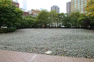 The square and park began to attract upscale residents,[11] and was continually upgraded, with the addition of gaslight and curbstones, the laying out of streets around the square – which the church laid out, graded and named, but then ceded to the city,[18] the construction of a fence around the park in 1866[5] to which residents received keys, and extensive landscaping,[12][6] including gravel paths and flowerbeds, and trees such as catalpas, cottonwoods, horse chestnuts and silver birches.[17] In addition to serving the local residents, the park was used for church events, including annual festivals for children of the parish.[19] During the coldest winters, the park trustees flooded the park to create a large ice skating rink.[20]