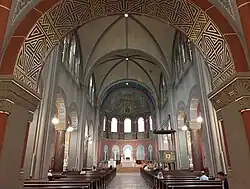 The apse is semi-circular. The mosaic in the apse is a copy of the medieval upper church of San Clemente al Laterano in Rome. The walls were decorated with murals in the style of the Beuron Art School, completed in 1926. The altar area was remodelled in 1989/90. Its five high windows were made of Cryolite glass panes, similar to alabaster. The main altar and other furniture were made of Carrara marble. The Romanesque Revival altar of the Virgin Mary was retained unchanged.[1]