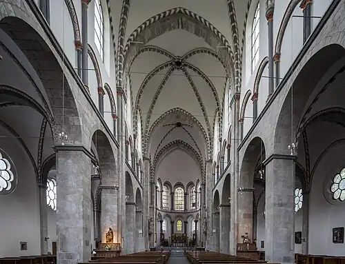 The eight medieval glass windows in the apse area were made between 1220 and 1230. The upper three windows show Saint Clement, the original patron of the site, the Tree of Jesse and Saint Cunibert. The windows of the lower band show Saint Ursula, Saint Cordula, Saint Catherine, Saint Cecilia and John the Baptist.