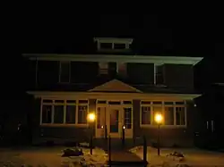 Adjacent to the church on the west is a brick rectory; built in 1914, it replaced a small wooden rectory that has since been moved to a different part of the village. Constructed in a vernacular style, it is a square two-story structure with an ashlar foundation and an enclosed front porch. A hip roof of asbestos shingle, pierced by multiple dormers, covers the building. Among its most striking features is a stone cross, located between the second-story windows on the front of the house.[8]