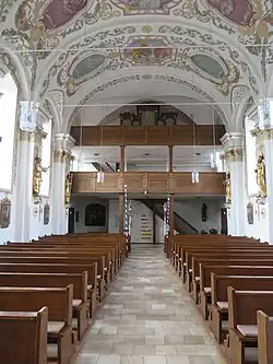 The interior is spanned by a barrel vault, which was decorated with neo-baroque ceiling paintings in 1921. The high altar, erected in 1783, features a depiction of Saint Martin of Tours flanked by sculptures of the archangels Michael and Raphael.
