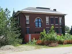 The school (1912) is a two-story brick structure built on a Bedford limestone foundation. The nearly square-plan building is capped with a low hipped roof and projecting rafter ends beneath the eaves. It features a full-height frontispiece that slightly projects from the main block. The main entrance into the building is recessed in a round stone arch. Above the entrance is a Palladian window on the second floor. On the north side of the building is a secondary entrance located in a small, hipped-roof porch.