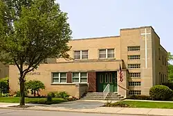 The Rev. John DeGroote bought 14 lots in the Oak Park addition of South Bend in 1921. Initial plans called for a building to house a combined church and school, but because the estimated cost of $35,000 was considered too expensive, Bishop Herman Alerding suggested a more modest wooden structure to serve temporarily as a church.[1] The Rev. Theodore Hammes was appointed as the parish's first pastor and initially lived at St. Monica's parish in Mishawaka. Twenty-two men volunteered to help build the church, which was constructed in May 1922 for $10,000.[1] The sanctuary was dedicated August 13, 1922, with a parish hall in the basement. The congregation quickly outgrew the structure's capacity of 240, and in October 1923, church leaders dedicated an expansion that increased the seating capacity to 600. The parish purchased six additional lots in 1924 which became the site of a school in 1929.