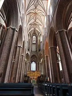 The building was erected on the site of a former chapel which the town council had initiated while other churches were built by religious orders. It served the people of the Wasserviertel and was consecrated in 1409, to Saint Nicholas.[1][2] In 1420, the town council decided to expand the chapel to a church, which was completed in 1440.[3] The church is one of the latest brick Gothic basilicas.[1] It features a prominent nave with a "star" rib vault which is unique in today Northern Germany.[3]