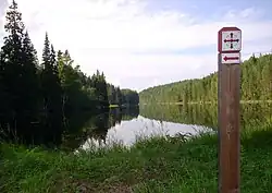 The trail is marked with the St. Olav symbol, which marks all the so-called St. Olav roads (Swedish: S:t Olavsvägar), leading towards Nidaros Cathedral. St. Olavsleden passes through the ancient cultural landscape, following as closely as possible the roads and paths that pilgrims of that time and other travelers wandered and rode. The first hundred kilometers the trail mostly follows Ljungan river, and in Jämtland the trail goes along the lakes Revsundssjön and Storsjön, and eventually Indalsälven river. St. Olavsleden crosses the Scandinavian mountains on the border between Sweden and Norway along Swedish county road 322 (Skalstuguvägen) and in Norway goes through the agricultural landscape near the Trondheim fjord. St. Olavsleden is moderately hilly which makes it suitable for cycling.[3]