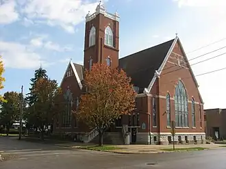 St. Paul Methodist Episcopal Church, also known as St. Paul United Methodist Church, is a historic Methodist Episcopal church located at Rushville, Rush County, Indiana. It was built in 1887, and is a one-story, cruciform plan, Victorian Gothic style brick building with a steeply pitched gable roof. A basement was added in 1923. It features a square bell tower, Gothic arched windows, decorative stone bands, and terra cotta accents.[2]: 5