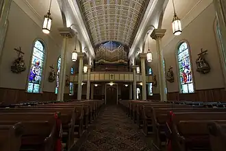 St. Peter Catholic Church has the largest functioning pipe organ in the city. Stenciled with grey, olive, and brown and decorated with gold and silver leaf, the 1891 Kilgen Pipe Organ cost $380,000 originally. Twenty-seven of the 2,150 pipes in the set were replaced in the 1992 restoration of the set. Prior to the restoration, the organ set was silent for almost thirty years.[4]