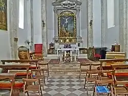 The church has one nave with a Gothic-cross-ribbed vault. The lateral windows are also Gothic with the typical pointed arches. Nevertheless, the main facade with the Renaissance elements on the portal and the three-leaf semicircular top as well as the semicircular apse reveal a recognizable Renaissance style.