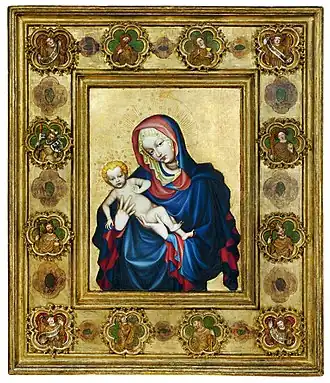 The picture itself survived separately in the possession of the Metropolitan Chapter. The picture's frame was purchased in 1883 from the estate of Josef Vojtěch Hellich for the Prague City Museum, from where it came to gallery of the Society of Patriotic Friends of Art. In 1937 Vincenc Kramář, director of the Society, joined both parts and since 1940 the picture and its frame have been loaned for display at the National Gallery in Prague. Information from the St. Vitus inventory of the late 15th century mentions a beautiful panel of the Virgin Mary with the portraits of the four Evangelists and four patron saints of the Czech lands. It is recorded that they were painted by ‘Prague Panices’ (Prague Junkers) – free artists who appear in written sources from the 15th century.[2] The St Vitus Madonna was exhibited in New York City in 2005.[3]