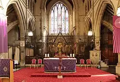 The interior is particularly striking, and features the extensive use of murals, mostly by the Victorian designers Heaton, Butler and Bayne. Most of the murals have been painted directly onto the walls; only those at high level in the chancel are marouflage. The reredos paintings are on mahogany and portray the Crucifixion and the Apostles.[6] The murals on the walls of the nave depict the life of Jesus from the Annunciation to the Ascension. Figures from the Old Testament and the New Testament are in the chancel above the string course.
