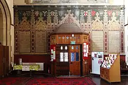 The church also includes an unusual First World War memorial listing those from the parish who served and returned.[6] It has been restored and is now hung in its original position at the east end of the north aisle.