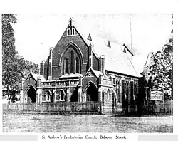 1. ^ a b c d e f g h i j k l m n o p q r s t u v "St Andrew's Presbyterian Church (entry 600785)". Queensland Heritage Register. Queensland Heritage Council. Retrieved 1 August 2014.