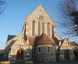 In 1924, another architect, K.D. Young, added the vicarage.[27] Its design is similar to that of the vestry and church, and it was also thought to have been built at the same time until later research disproved this.[30] The flint and stone structure has a twin-gable east façade, windows of unequal sizes (and including one bay window) but all with transoms and mullions, and two very narrow windows above first-floor level. The gables are not of equal size.[30]