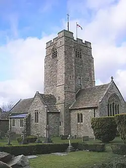 The church is constructed in stone, with stone-slate roofs. Its plan consists of a four-bay nave, two-bay north and south aisles, a south porch, a south transept, a north organ loft and vestry, and a chancel. A tower stands on the crossing. The architectural style of the church is Perpendicular, freely expressed. The aisle windows have two or three lights, The window in the transept has two lights, and that in the organ loft has three lights. There is a three-light west window, and in the chancel is a five-light east window, and a two-light window on the south side. The south porch is gabled with a three-centred arch, above which is a niche containing a statue. On the southeast corner of the tower is a square stair turret. On the west side of the tower is a single-light window, with a clock face above it. The three-light bell openings are louvred. The parapet is embattled, and on top of the tower is a pyramidal roof surmounted by a tall cross.[2]