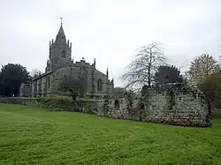 In addition to the college of priests, the income of the foundation was for the support of thirteen disabled poor men[25] (tresdecem pauperum debilium).[24] At the same time, Dame Isabel had almshouses built at the western end of the church that would house 13 people.[32] The almshouses (also known variously as the hospital) were abandoned and rebuilt off-site in Tong village in the late 18th century.[33] The derelict almshouses were destroyed in the 19th century by the then owner of the Tong estate, Mr George Durant. Only one of the outside walls is left standing today[34] which is grade II listed.[35]