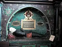 Sir Hugh Calveley (died 23 April 1394) was an English knight and commander, who took part in the Hundred Years' War, gaining fame during the War of the Breton Succession and the Castilian Civil War. He held various military posts in Brittany and Normandy. He founded the college of which St Boniface was the collegiate church, in the 1380s. His alabaster tomb and effigy is in the centre of the chancel and is enclosed within contemporary ironwork,[14] though there is some doubt as to whether he was in fact buried there. The niches in the sarcophagus originally contained weepers (small figures of mourners).[13] The effigy was likely commissioned by Sir Robert Knolles.