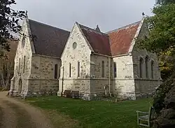 The church dates from 1847 and 1848 by the architect Ferrey.[1] It was built to replace Old St Boniface Church, Bonchurch, which nevertheless has escaped demolition. The church is cruciform in shape with a south porch and two north vestries and an organ chamber. The bell turret contains a single bell which weighs 4cwt and is tuned to the key of Eb. Much of the funds for building the Church were paid for by Captain Swinburne, father of Algernon Swinburne, the poet. The highly formidable Tractarian family, the Sewells, were deeply involved in the formation of this Church.