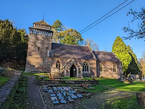 The “prominent”[18] tower dates from the 14th century. It has a pyramidal roof with timber-cladding.[12] The remainder of the building dates from Pritchard and Seddon's reconstruction. It is constructed of Red sandstone rubble and roofed in red tiles. Cadw calls the style Decorated Gothic Revival.[4] Next to the altar is the grave of Matthew Pritchard.[8] The church contains a plaque commemorating the men of the parish who died in the First World War, headed by the name of John Rolls, 2nd Baron Llangattock, who died in October 1916 from wounds received at the Battle of the Somme.[19] It also houses a Royal Arms of Wiliam III dating from 1700.[12][d] The church is a Grade II listed building.[4]