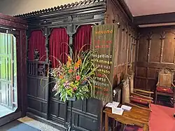 In the south-west corner of the nave is a choir vestry, which was originally built as a baptistery.[30] Its screen is made of carved oak, formed in 1883 from one part of the Fleetwood family box pew that was originally situated in the chancel where the choir stalls now sit.[17] In 1883, this pew had been described as "looking like a cross between a railway carriage and the centre piece of a gondola".[17] The wood is carved with emblems of the family including a double-headed eagle, wheat sheaves and a griffin.[30] The screen door comes from the box pew of another prominent local family—the Rigbys of Layton.[16] It has a carving of a goat's head and is inscribed with "AR 1636".[26]