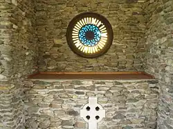 The rear of the structure has a raised platform separated from the body of the chapel by timber altar rails. A random rubble stone wall to the underside of the roof trusses creates a recessed central altar with a door to either side accessing rear side rooms. The altar has a central rose window consisting of coloured glass in a fretwork frame, below which is a large shelf surmounting a marble cross set in the stone wall. A free-standing random rubble pulpit is located at the southern side of the altar. The rear side rooms are enclosed with fibrous cement sheeting, and each has a sash window at the rear and a door opening onto a recessed porch behind the altar. The northern room contains a commemorative plaque fixed to the side wall.[1]