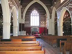 Between 1883 and 1889, an ambitious new chapel was built, seating 500, funded by private patients and also built entirely by the asylum's inmates. The chapel included a multicoloured interior, using strips of polychrome glazed brick.[2]