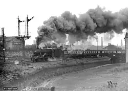 A third line, connecting Laisterdyke with the Queensbury Lines, ran along the south of the station, but it was not given platforms. The triangle was used to turn whole trains (steam locomotives and coaches) to enable them to run boiler first from Bradford Exchange railway station.[4] This practice continued until 1972 (when the lines were closed through St Dunstans) if a DMU needed turning, usually because it could not be driven from one end.[5]