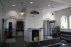 The station buildings are constructed of granite in an 'L' shape west and north of the St Ives bay platform. The booking office is staffed for part of the day and is located in the west-facing section which faces the station car park. The northern range incorporates staff accommodation as well as refreshment facilities which appeared in a list of the ten best station cafes published in The Guardian in 2009.[12] Platforms 2 and 3 have a long canopy above them to protect passengers waiting for their train. At the west end of this is a covered footbridge which links with the main westbound platform for trains to Penzance, and a large wooden shelter is provided here. A small granite building further up the platform is for staff use. As with several other stations in Cornwall, small palm trees grow on the main platforms, both of which can accommodate seven-coach trains.[13]
