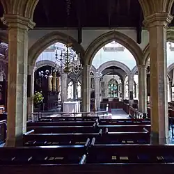 The church spire is a landmark of the town. The earliest parts of the church are late 12th- or early 13th-century. Some of the windows are 14th-century and the building was remodelled in the 15th and 16th centuries.[4] The building was restored in 1869–73 to plans by the Gothic Revival architect Henry Woodyer.[5] Of note within the church are the painted ceiling panels of the north aisle, dating from about 1390 and representing the Tree of Jesse.[6] The church is a Grade I listed building.[7]