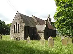 The church is built of sandstone, and has a clay tile roof, with spiked tiles on the ridge. The building consists of a five-bay nave, two-bay chancel, north vestry and south porch. At the west end is a double bellcote and below a small tower and spire. There are lancet windows throughout, with the east window having three lights. Inside, there is a chancel arch with dogtooth moulding, and an arch-braced timber roof.[4]