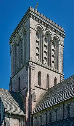 The central tower is the chief feature of the church, and it rises two stories above the ridge of the roof. Supported by angle buttresses, the ringing chamber is lit by three lancet windows on the west and north sides, those of the south and east sides only featuring one central lancet. The belfry stage above follows the same plan, with two sides containing three lancets, and two sides containing one. However, these are louvred, rather than glazed. They also feature several recessed arches surrounding the louvres. The tower is crowned with a moulded parapet, which features stepped coning.[2]