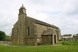 The church is built of sandstone with a Welsh slate roof. It consists of a nave and a chancel under one roof, a south porch and a north vestry. On the west gable is a bellcote with a corbelled cupola. The porch is gabled, and has a four-centred arch with the date on the apex stone. Inside, the old window head is in the vestry, while there is a timber screen at the west end of the church. There is a wall monument to the Reverend James Robinson.[2][3]