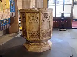 The interior is in Stourton stone with a Yorkshire stone floor. The nave has a hammerbeam roof. The arcades are carried on clustered piers. The former intricately carved chancel screen now acts as a reredos behind the altar at the east end of the nave. The stone pulpit, which contains marble panels with niches depicting scenes from the life of Christ in semi-relief, is a memorial to the Rt Revd James Fraser, Bishop of Manchester, who died in 1885. The octagonal font is in alabaster and is decorated with panels. Box pews, one of which is dated 1728, have been re-used as dado panelling in the vestry. In the nave are lamps designed by Peter Skinner. The stained glass in the east window, dated 1896, is by C. E. Kempe, and a window in the south aisle contains glass by Ward and Hughes dating from 1895. In another south aisle window is glass from 1922 by Edward Moore, which has been moved from the north chapel. The rest of the windows have been re-glazed after the 1991 fire with clear glass.[10] The two-manual pipe organ was built in 1967 by Hill, Norman and Beard,[14] replacing an earlier three-manual organ of 1888 by J. C. Bishop and Son.[15]
