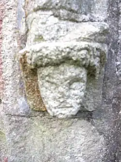 The chief entrance is a south-facing porch with an inner and outer arch. The outer arch is ornamented with cable moulding and foliage. On one of the spandrels of the inner arch, which is made of Caen stone, is the monogram i h c, while on another can be found an encircled Greek cross.[6] An arched west doorway includes carved moulding and carved heads are used as label stops. A priest's doorway to the right of the stair projection is small and rounded.[1] The arcades are characterized by granite arches supported on granite pillars.[6]