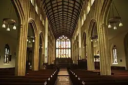 There is no chancel arch. Between the nave and the aisles are four-bay arcades, with Tudor-style arches carried on lozenge-shaped piers, and there is a three-bay arcade between the chancel and the chancel chapels. The stone reredos dates from 1838 and consists of canopies over inscriptions of the Creed, the Lord's Prayer and the Ten Commandments. There are carved screens between the chancel and the aisles dating from about 1900.[1] The Jacobean communion table was donated to the church in 1610.[3] The wooden pulpit is polygonal.[1] It dates from 1906, and contains carved figures of the Four Evangelists, Bishop Egwin, and Saint Lawrence.[3] The font is medieval and consists of an octagonal bowl on an octagonal stem. The south chapel has a stone fan vaulted rood and a floor of encaustic tiles. It contains a copy of the medieval font.[1] In the east window is stained glass of 1862 by Thomas Willement, which includes depictions of the Resurrection, the Last Supper, and coats of arms.[3] The windows in the north and south sanctuary walls are by Gibbs. The east window in the south aisle dated 1847 is by O'Connor, and the east window in the chapel is by Hardman & Co. In the north aisle are three windows from the early part of the 20th century by Geoffrey Webb, and there are other windows from later in the 20th century by Evans and Co. of Smethwick, Paul Woodroffe of Stroud, A. L. Wilkinson and Francis Skeat.[1] The two-manual organ was made by Nicholson of Worcester in 1867.[3][4]